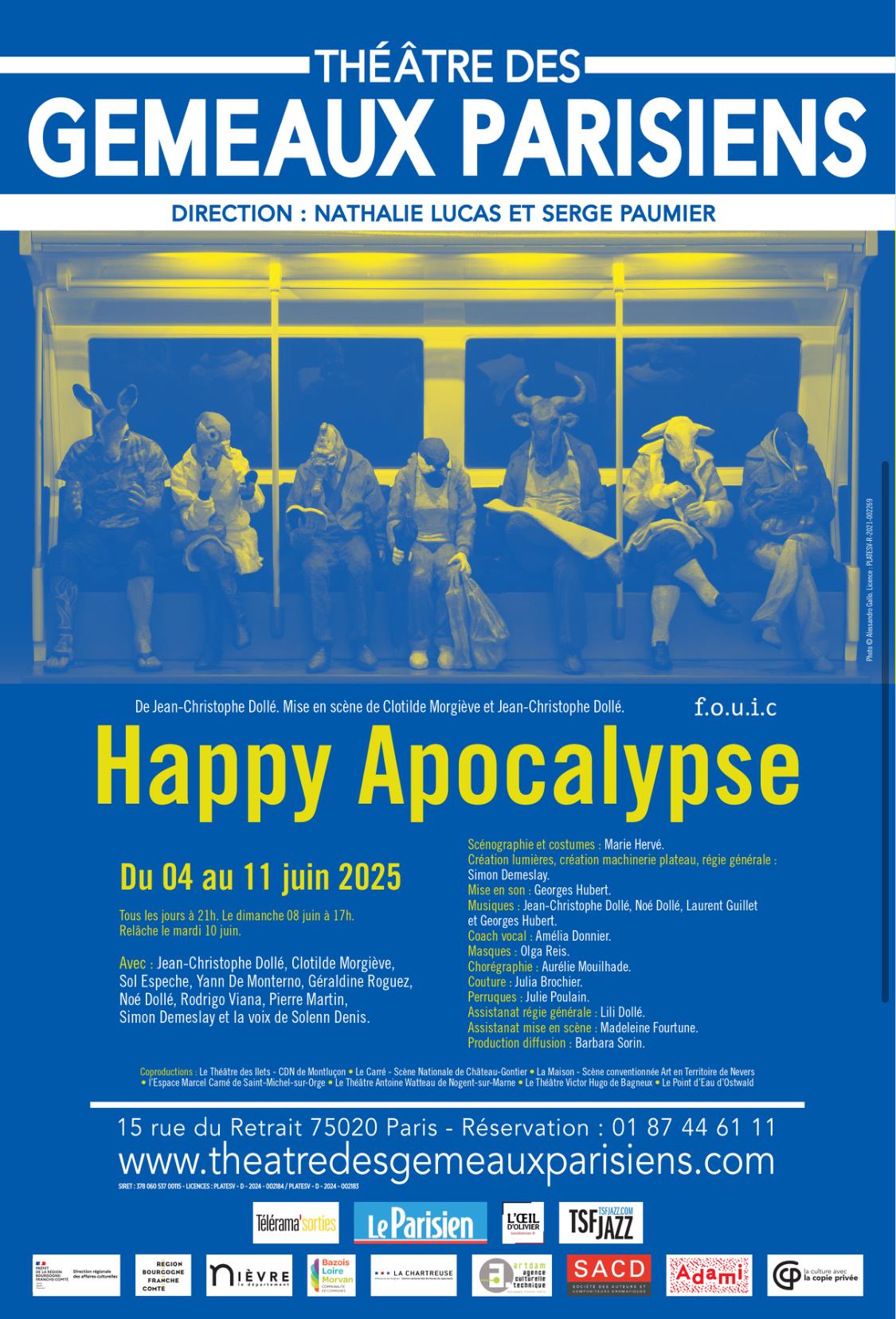 Happy Apocalypse nous plonge dans un monde furieusement festif. La musique électro-pop, le burlesque et l’astrophysique s’y croisent à travers des personnages fantasques et un peu fous. Pourtant, dans cette société qui a perdu la tête, Natacha refusant cette fuite en avant, décide d’assumer sa part de faiblesse, et sa finitude.