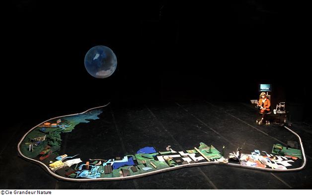 Entremêlant littérature et théâtre d’objet, la pièce embarque les spectateurs.trices dans la fabrique d’un voyage imaginaire fait de travellings bricolés, de trucages faits maison et de mondes imaginés. Une mini caméra-basket traverse des paysages miniatures, tels cette pelouse en éponge grattante ou ce dancefloor de boîte de nuit en râpe à fromage et leds de vélo.