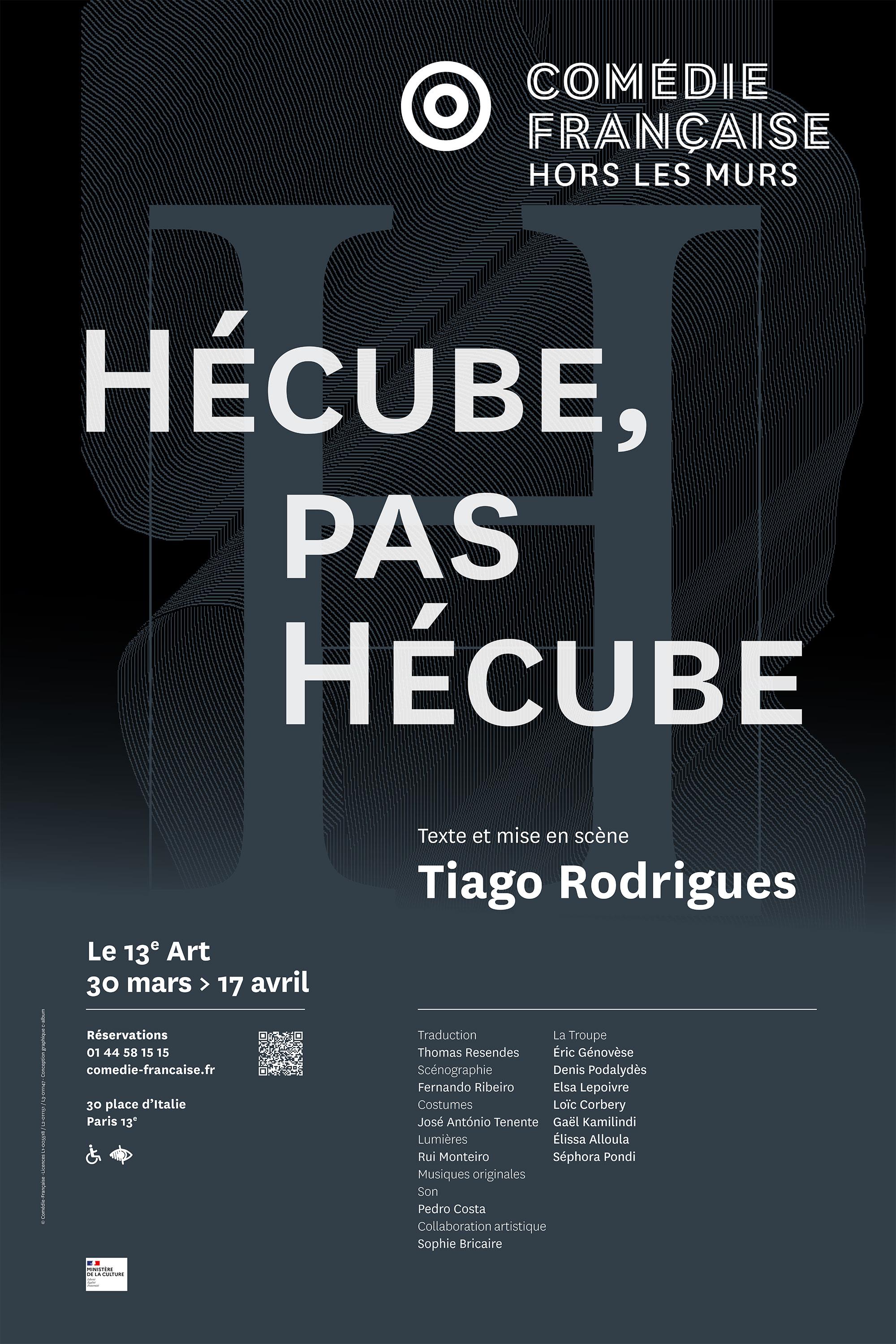 Et comme il est d’usage dans son théâtre d’une adresse directe au public, il mêle aux enjeux atemporels de la femme antique, troyenne, ceux d’une femme d’aujourd’hui, comédienne et mère, prise au cœur de tourments similaires. Tiago Rodrigues a coutume de dire qu’il n’écrit pas de pièces pour le théâtre mais pour les comédiennes et comédiens qui font la pièce. Ici donc, une actrice répète Hécube d’Euripide. Elle joue le rôle de la veuve de Priam. Celle qui, dans la défaite de Troie, a tout perdu : son époux, son trône, sa liberté, et pour sa plus grande souffrance, presque tous ses enfants. C'est une femme qui réclame justice.