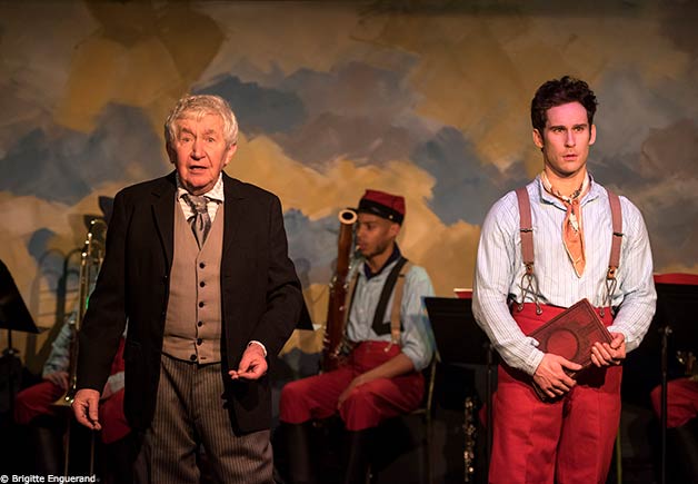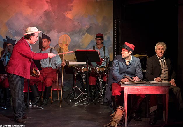L’orchestre est partie prenante de l’histoire. Il s’agit d’un régiment de soldats musiciens, dont se détache le héros, Joseph Dupraz, avec son petit violon, alpagué par le Diable alors qu’il rentre en permission. Les sept instrumentistes sont présents sur scène, en uniforme et à la queue leu-leu faisant face au chef, capitaine de l’orchestre-fanfare. Les uniformes choisis sont voisins de ceux de la Première Guerre mondiale, pantalons rouges et caban bleu. L’histoire se joue devant les musiciens rangés en ligne au fond de la scène. Le chef d’orchestre intervient lui-même parfois dans le jeu des acteurs. Ramuz et Stravinsky concevaient leur œuvre comme un mimodrame. Cette appellation réveille selon moi un univers un peu désuet. Mais on a ici, au Poche, un rapport très proche au public, qui induit une gestuelle plus symbolique.