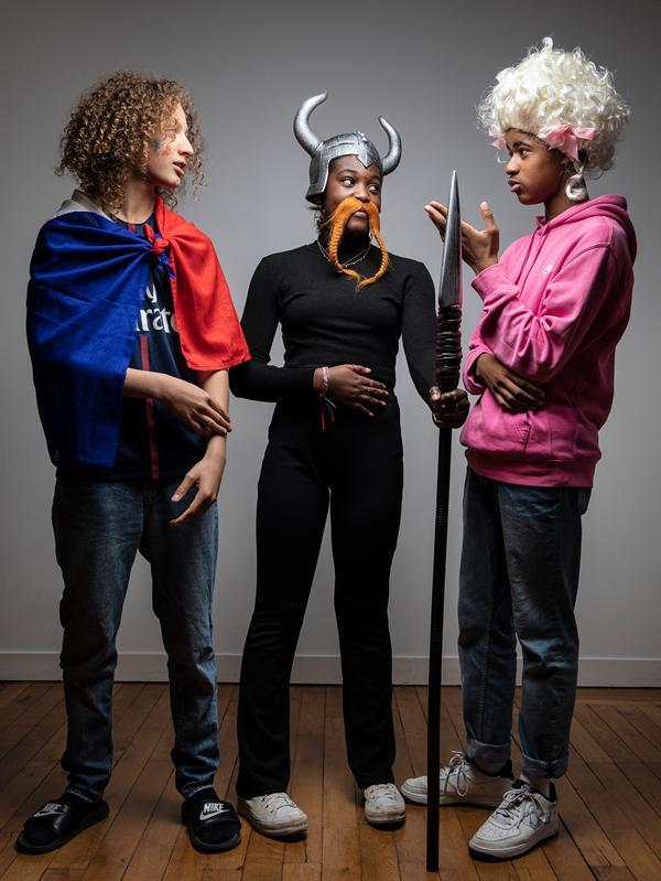 C’est de ce mythe fondateur qu’est parti Amine Adjina pour imaginer sa troisième pièce à destination de la jeunesse après Arthur et Ibrahim. Le temps d’un cours d’histoire, une professeure propose à ses élèves de choisir un moment de l’histoire de France et de le jouer devant la classe. Trois thèmes sont choisis : les Gaulois, la Révolution française et la victoire au mondial de football 1998. Les enfants se penchent à leurs manières sur les ambiguïtés du récit national et dessinent alors les contours d’une histoire de France qui se construit au pluriel et dans la diversité, avec une drôlerie salutaire.