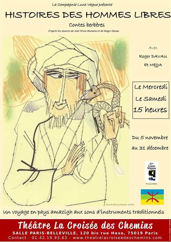 Histoires des Hommes Libres est composé de cinq contes berbères (trois adapté de contes de José Ferro Romano) interprétés par Roger Davau. Les contes sont variés. Parfois riches en vocabulaire, parfois plus simples et animaliers, ils forment un spectacle adapté aux petits comme aux adultes. La superbe musique de Mejja est le décor idéal de cet univers qui nous est à la fois si loin et si proche.