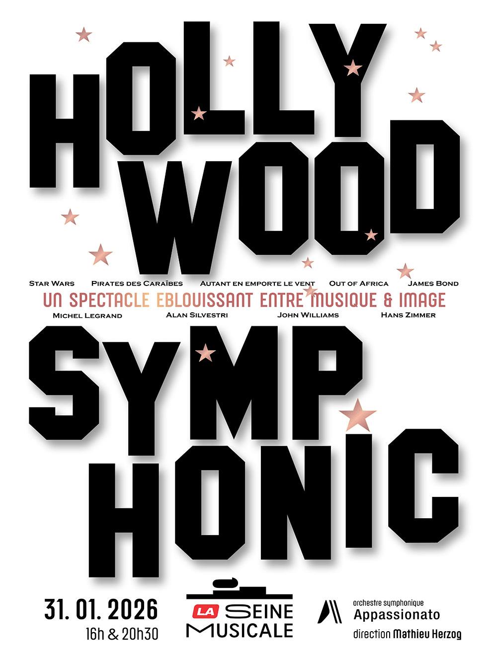 Hollywood Symphonic est un concert exceptionnel où l’Orchestre Symphonique Appassionato, dirigé par le truculent Mathieu Herzog, rend hommage aux plus grands compositeurs du 7ᵉ Art. Des chefs-d’œuvre de Michel Legrand à ceux de Hans Zimmer, John Williams ou Max Steiner, ce spectacle vous transporte dans un voyage symphonique à travers les époques et les émotions. Sur scène, la magie de la musique de film se marie aux images des films projetées, pour revivre les scènes cultes de Star Wars, Yentl, Out of Africa, Autant en emporte le vent et bien d’autres encore. Un rendez-vous unique où les images et les harmonies fusionnent pour sublimer le cinéma !