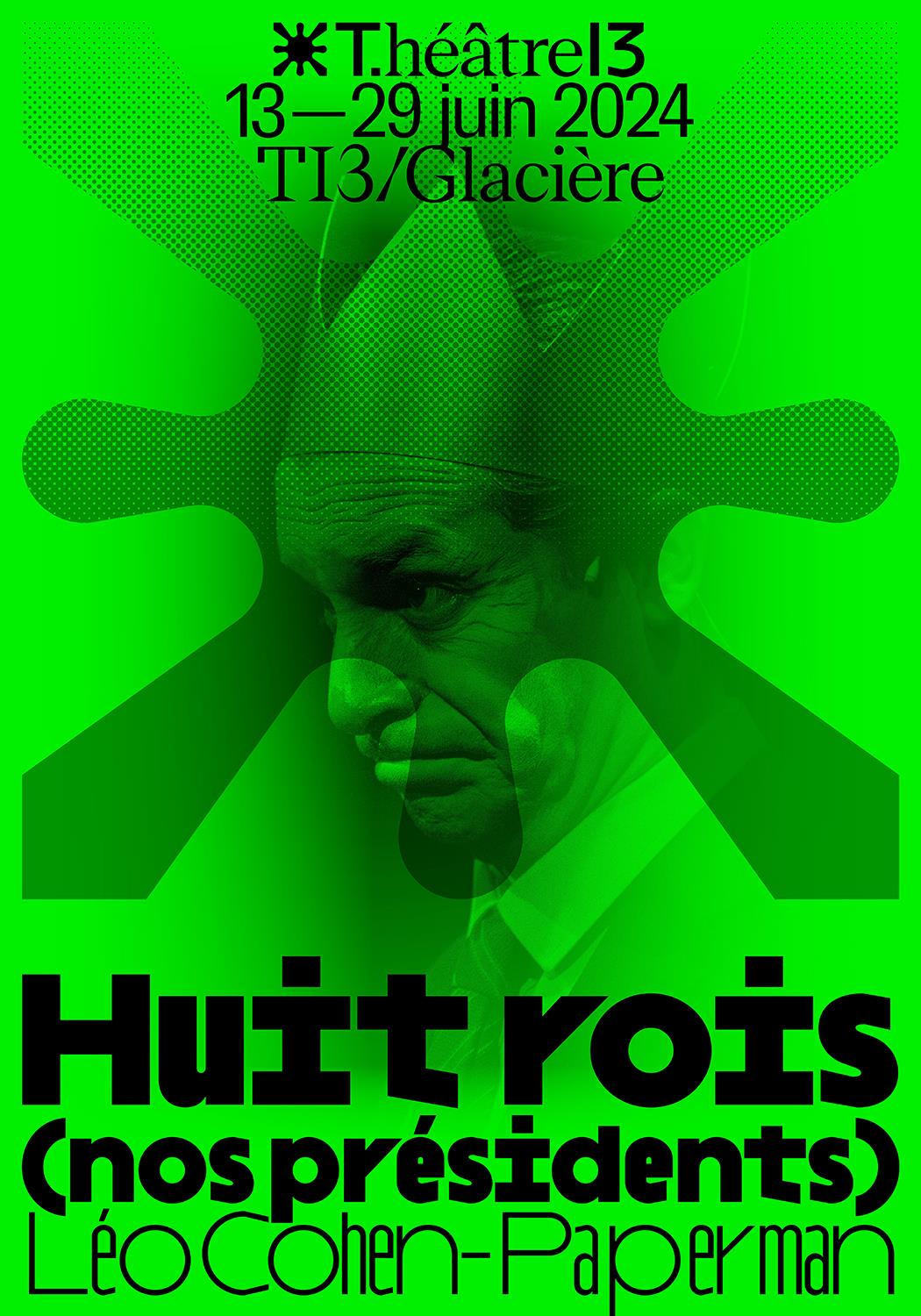Huit rois (nos présidents) est une série théâtrale de six spectacles co-écrite par L. Cohen-Paperman et J. Campani dont l’objectif est de faire le portrait de chacun des huit Présidents de la Ve République, de C. de Gaulle à E. Macron. Au Théâtre 13, seront présentés en alternance les trois premiers épisodes sur J. Chirac, F. Mitterrand et V. Giscard d’Estaing.