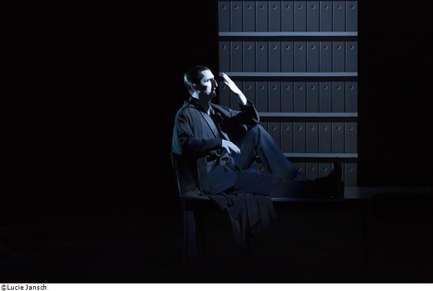 C’est un spectacle de rupture, I Was Sitting on my Patio… Robert Wilson le monte en 1977, un an à peine après la création d’Einstein on the Beach et son énergie entêtante. Un monologue sans drame y déverse un flot insensé d’associations d’idées, serti dans l’épure d’une scène en noir et blanc et animé d’une gestuelle anguleuse puis fiévreuse. Ce zapping verbal, débité une première fois par Robert Wilson lui-même dans un saisissement hagard, est repris à l’identique par Lucinda Childs qui lui imprime l’expressivité d’un effondrement intérieur. Minimalisme clinique, austérité formelle au prisme de ses contradictions. Rien n’arrive – surtout pas « ce type » (this guy) annoncé dès le titre et les tout premiers mots du texte; rien n’arrive et tout se passe; tout se passe et repasse dans la différence de soi, et repassera comme tourne un manège.