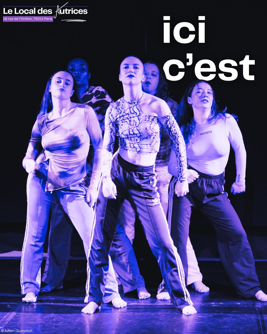 Dans un monde où les hommes et leurs avis prennent toujours trop de place, Ici c'est veut rendre aux femmes la liberté d’occuper l’espace physique et sonore. Fatigués, en colère et déterminés à riposter, les corps s’y mêlent en une meute prête à en découdre.