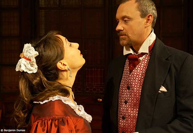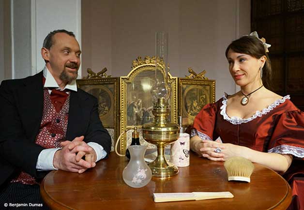 Pour mieux connaître le Comte et la Marquise, nous avons choisi de faire dialoguer Musset et Maupassant. Ainsi, Il faut qu'une porte soit ouverte ou ferméeest encadré par un soliloque du Comte autour du poème Si je vous disais pourtant que je vous aime de Musset et par Au bord du lit de Maupassant pour clore le spectacle.