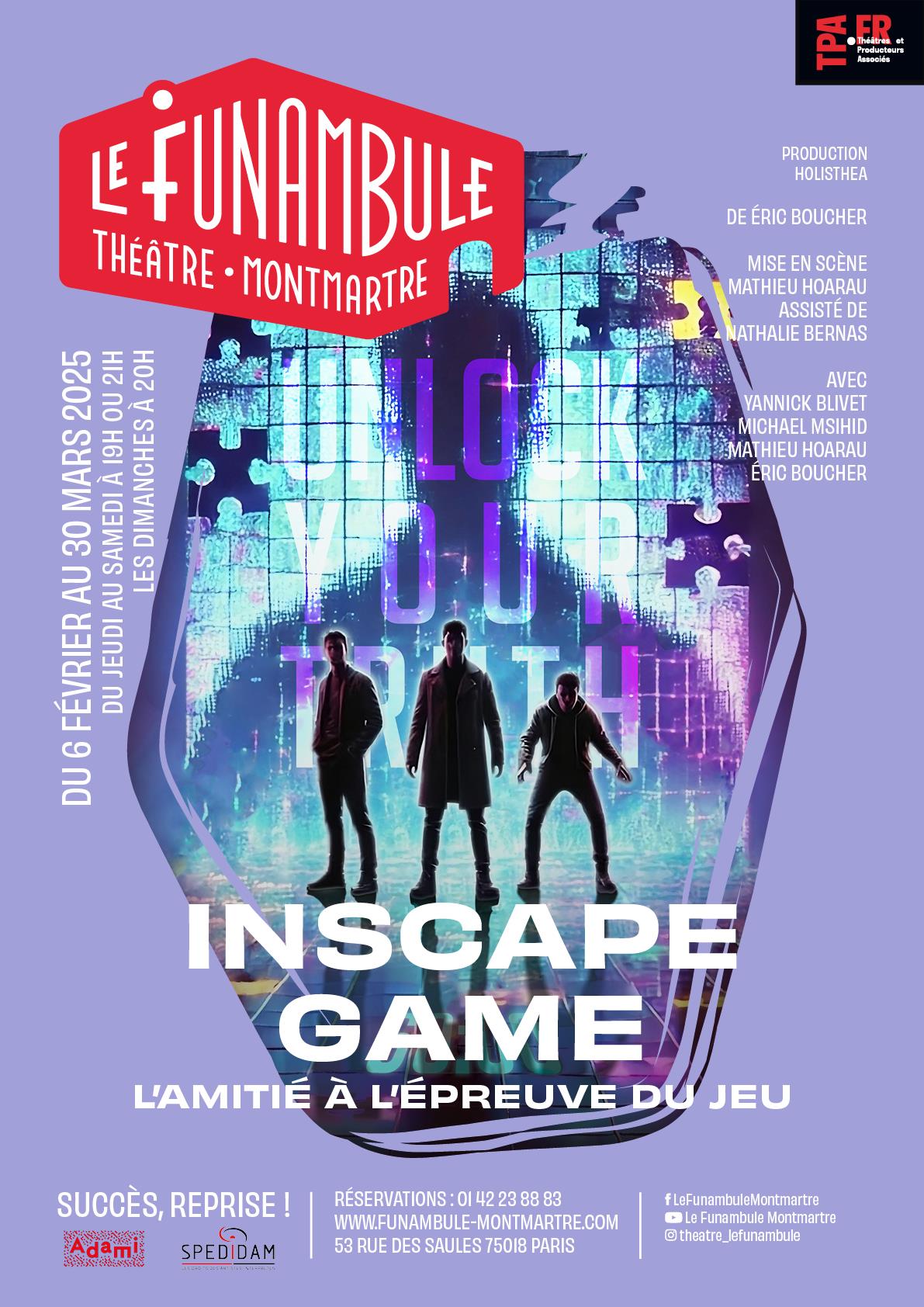 Inscape Game est une pièce à part. Elle questionne en profondeur notre manière de vivre : nos masques, nos certitudes, ce qu’on s’invente pour tenir debout… jusqu’au moment où la vie nous rattrape. C’est une pièce qui confronte, mais avec intelligence. Et cette confrontation, aussi inconfortable soit-elle, devient une libération. Les comédiens ne jouent pas : ils vivent. On oublie le théâtre. On est plongé dans quelque chose de brut, d’authentique, de troublant. C’est une expérience qui fait rire, qui touche, qui déstabilise — et surtout, qui résonne longtemps après. Le titre ne laisse pas forcément deviner ce qu’on va vivre. Et tant mieux. Parce que ce qu’on vit, c’est unique. Si j’y suis allée, c’est pour un ami qui est sur scène. Si j’en parle aujourd’hui, c’est parce que je voudrais que tout le monde y aille. Pour voir. Pour ressentir. Et peut-être, pour commencer à se découvrir.