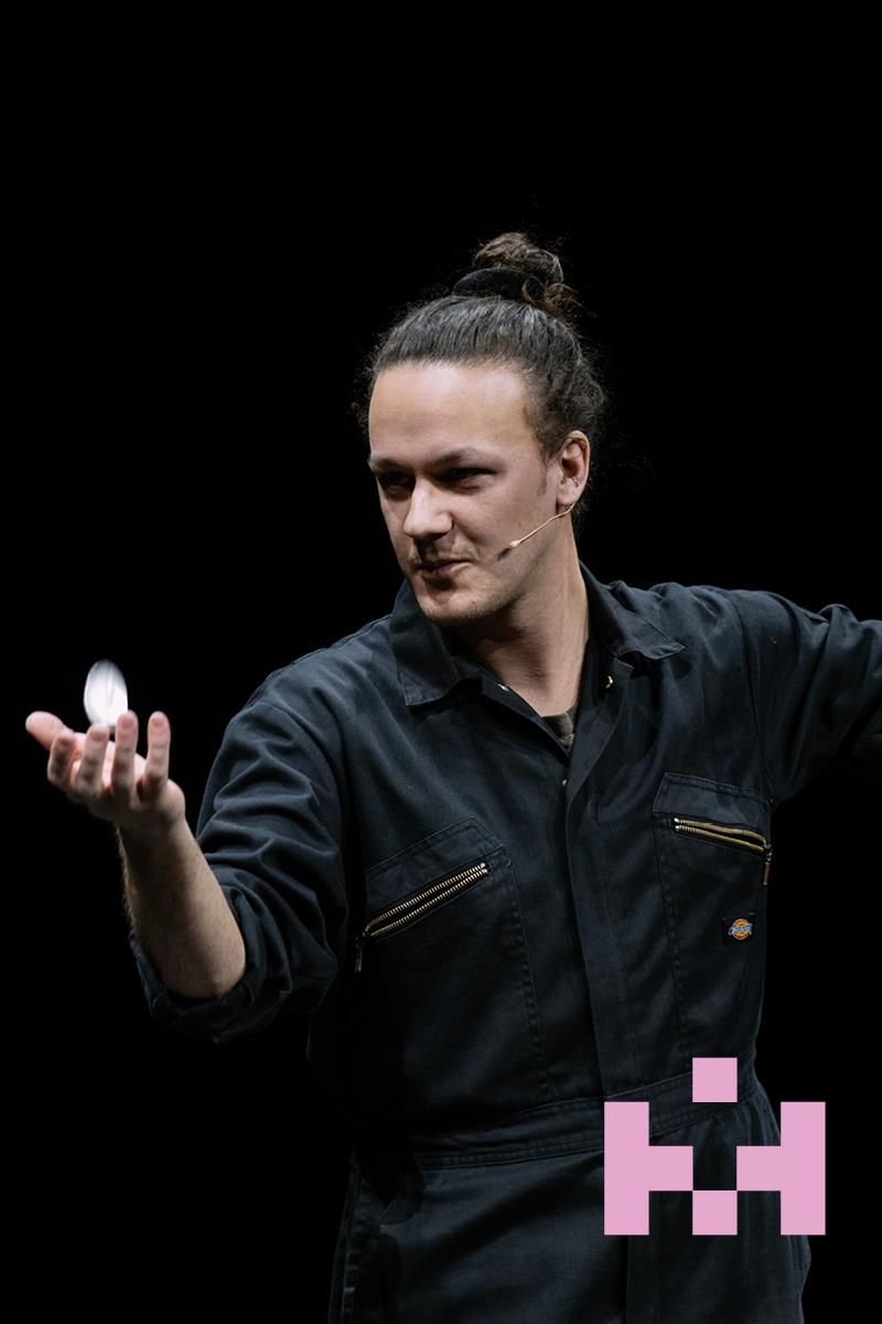 Présenter une pièce de monnaie sous nos yeux puis la ranger dans une poche pour la faire ressurgir de nulle part : si le geste de l’artiste est impassible, le trouble n’en demeure pas moins saisissant. Avec un charme fou et un sens comique avéré, il nous entraîne dans ses supercheries et nous prouve qu’à lui seul, rien n’est impossible !