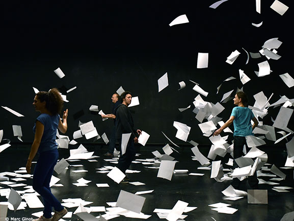 « dans ce spectacle, c’est le talent créatif des interprètes qui sublime l’usage des outils, simple feuille de papier, pince à linge, tablette électronique ou smartphone. La troupe réunie autour de Jean-Claude Fall (...) fait preuve d’un talent interprétatif remarquable et danse plutôt qu’elle ne joue cette partition des égarements. » Catherine Robert, La terrasse, 19 novembre 2017