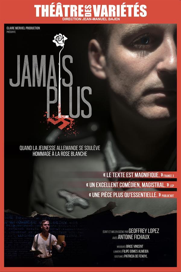 Inspiré d'une histoire vraie, Jamais Plus retrace l'histoire de la Rose Blanche, mouvement résistant en Allemagne pendant la Seconde Guerre Mondiale. Le comédien Antoine Fichaux est très juste dans ce spectacle subtil et non dénué d'humour.