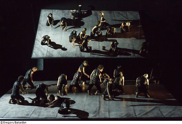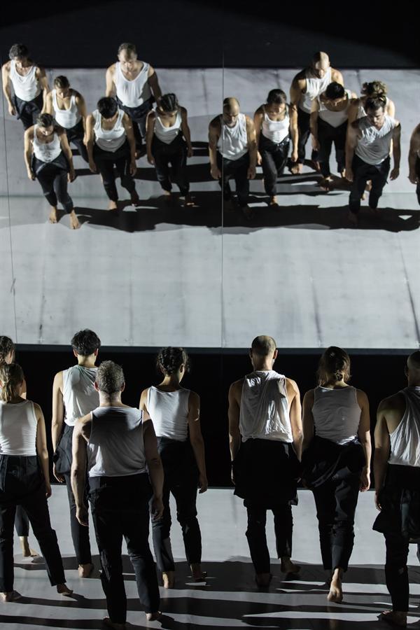 Treize corps surgissent d’une obscurité infinie, d’abord sans dévoiler tous leurs secrets. Un miroir géant, suspendu en plan incliné, renvoie leur image, plus réelle que le mirage des danseurs au sol. Les horizons s’effacent, les lignes de fuite sont faussées et la chair humaine devient émettrice de lumière quand progressivement l’obscurité cède la place à une blancheur aveuglante.