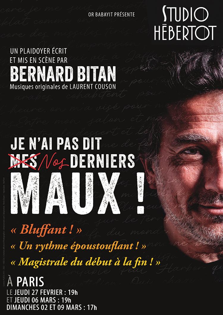 Dans Je n'ai pas dit mes (nos) derniers maux, Bernard Bitan porte surtout haut et fort la voix de tout un peuple en dressant un plaidoyer vibrant, très personnel et sans concessions pour le peuple juif et Israël. « Un spectacle à voir et à revoir » « IMMANQUABLE ».
