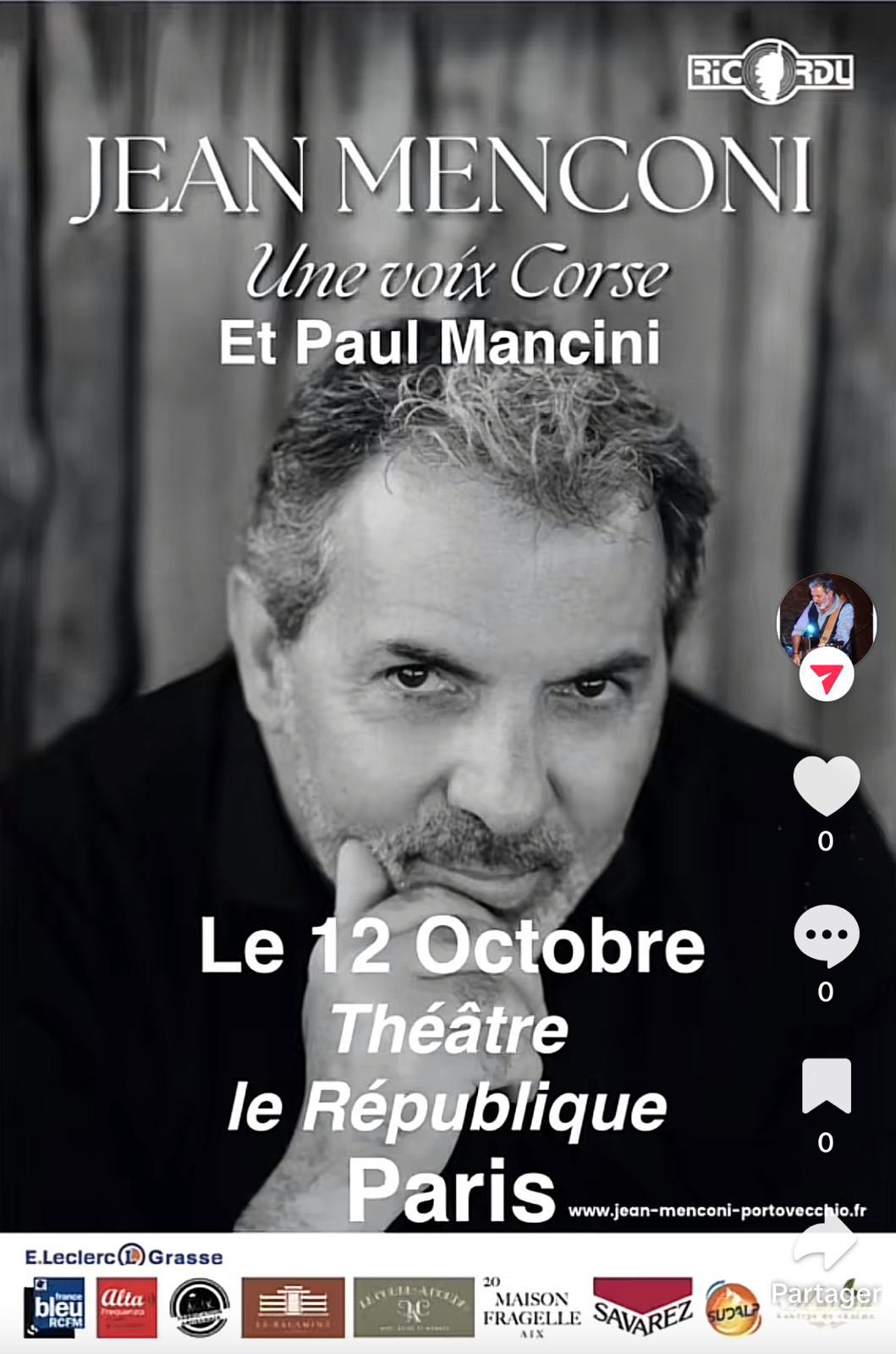 Cet homme Corse dans toute sa noblesse et sa fierté, citoyen du monde, partage sa passion et emporte son public avec lui. Il exprime une large palette de sentiments et décline ses couleurs qui se dessinent et enflamment talentueusement la scène. L’univers musical de Jean Menconi est ouvert sur le monde et sa mixité, ainsi la chanson traditionnelle corse se marie avec talent à la variété internationale et aux chants corses pour notre plus grand plaisir.