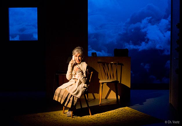 Le défi, pour le metteur en scène, sera d’assembler tous ces degrés de lecture pour proposer un tableau d’ensemble cohérent ; de faire la navette entre le spectateur et les personnages pour tricoter la relation complexe qui se noue devant lui. Nous avons fait le choix d’une scénographie épurée. Même si l’enfermement est un des thèmes importants de la pièce, nous avons préféré privilégier l’idée de hauteur (Jeanne habite en haut d’une tour), et l’espace qui l’entoure (le ciel), comme un vide oppressant supplémentaire. Et la porte qui s’ouvre dans ce ciel fantasmé, n’est que le prolongement de celle de son appartement, toujours fermée à double-tour. Une simple baie vitrée la sépare de ce vide omniprésent d’où elle se sent toujours observée.