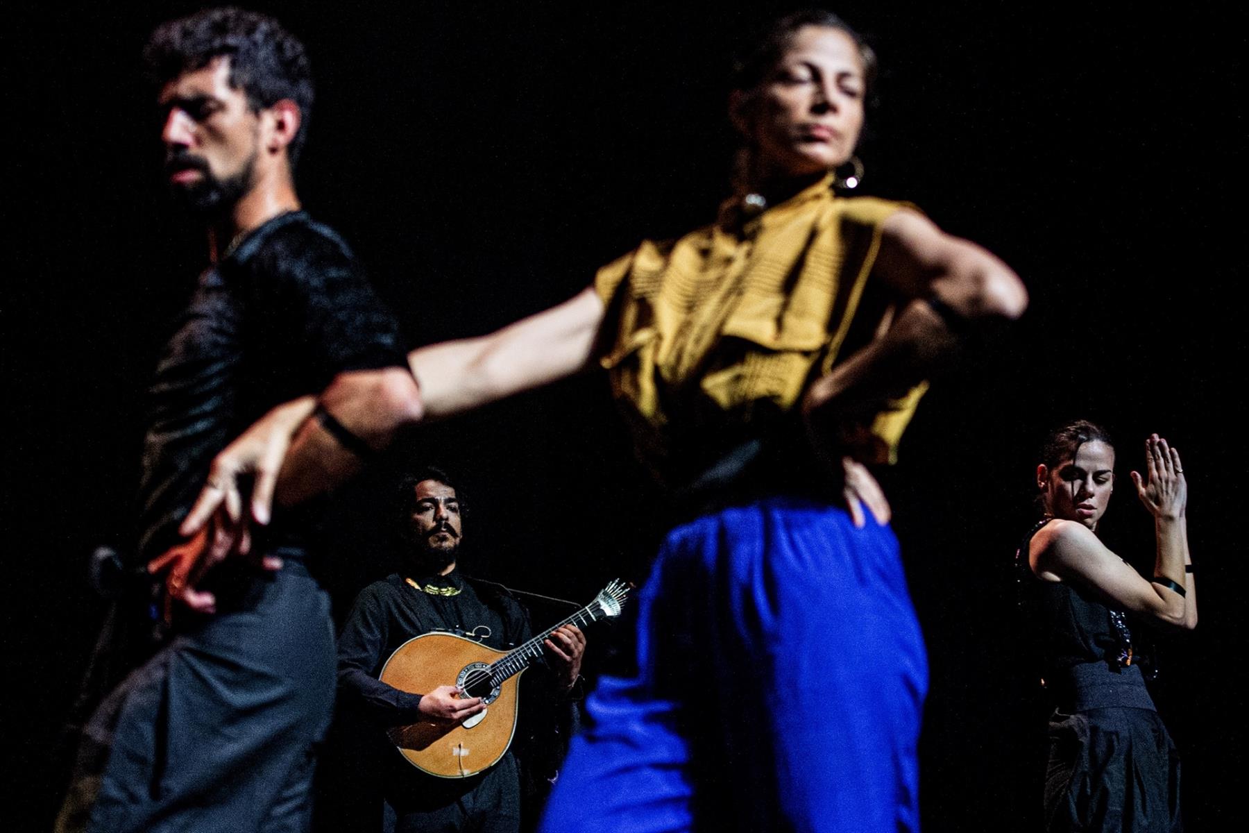 Le duo portugais Jonas & Lander marque depuis plusieurs années le milieu de la danse par ses spectacles fantaisistes et musicaux. Performance hybride, entre danse et concert, Bate Fado s’inscrit dans cette lignée : danseurs, chanteur de fado et musiciens se retrouvent au plateau, virevoltant, frappant des pieds, claquant des mains, laissant les vibrations de la musique imprégner leurs corps. À partir de 12 ans