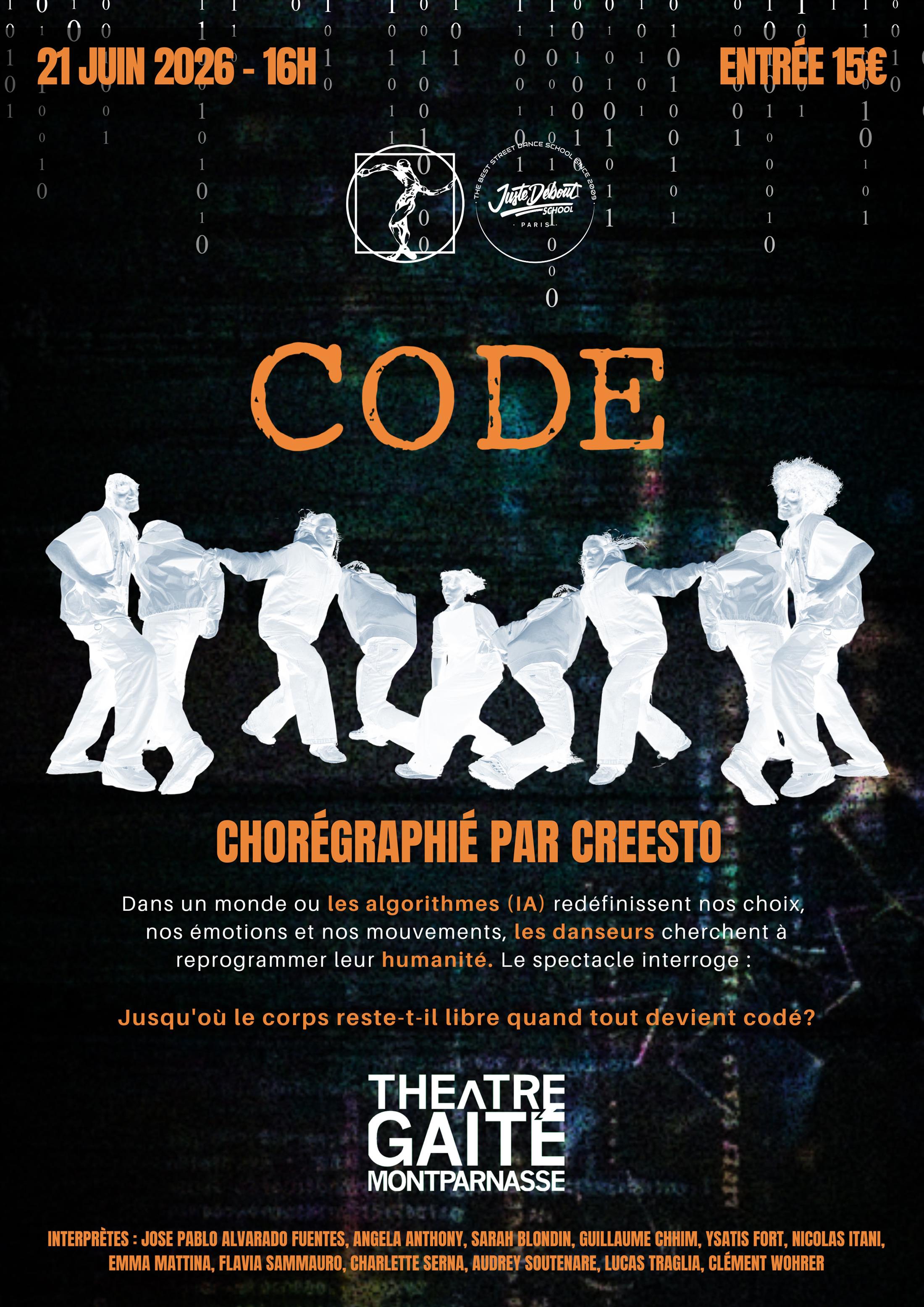 Code est un projet mené par le chorégraphe Creesto pour 12 danseurs en 3e et dernière de formation professionnelle au sein de la Juste Debout School. Elle met en exergue la vitalité et le vocabulaire de Street dance, l’étendue des talents de ces danseurs et la qualité de l’enseignement de la Juste Debout School.