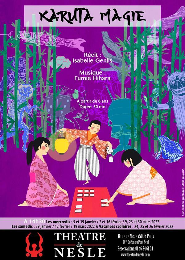 Un jeu de carte et de contes et la magie opère. Les cartes du Karuta Magie, disposées sur un tapis rouge, attendent une main innocente… Piochez-en une et la formule magique inscrite sur son dos appellera les récits des êtres fantastiques du Japon. Accrochez-vous aux notes, attrapez chaque mot pour cette envolée enchantée.