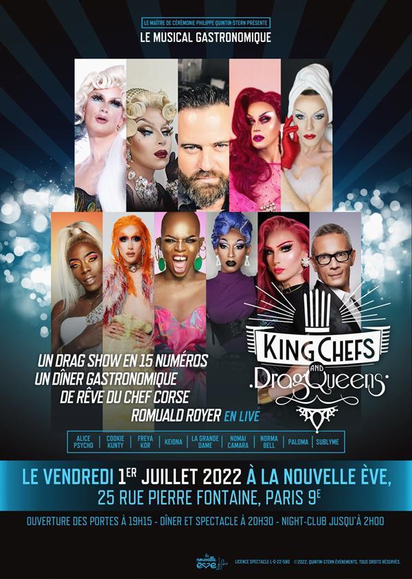 Drag show magique avec 9 artistes dragqueens, option menu gastronomique en 4 services du chef corse Romuald Royer, vous allez vivre une expérience unique avec la troupe KINGCHEFS AND DRAGQUEENS au cabaret La Nouvelle Ève, Paris 9e.