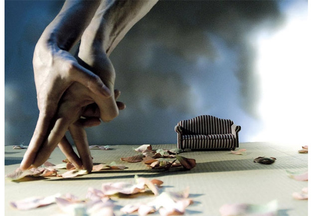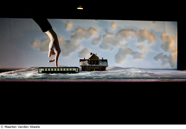 Sur le plateau, la magie de l’amalgame des arts opère un fascinant ballet. Le théâtre et la danse, la vidéo et les arts plastiques, le cinéma et la manipulation d’objets minuscules. Tout contribue sur la scène immense à un ballet grandiose que seules deux mains dansent. Les doigts filmés, dansants, sont projetés sur un écran géant, en direct. Parmi les constructions miniatures, les mains des deux danseurs acteurs produisent des paysages, des images, des mouvements d’une poésie intense.