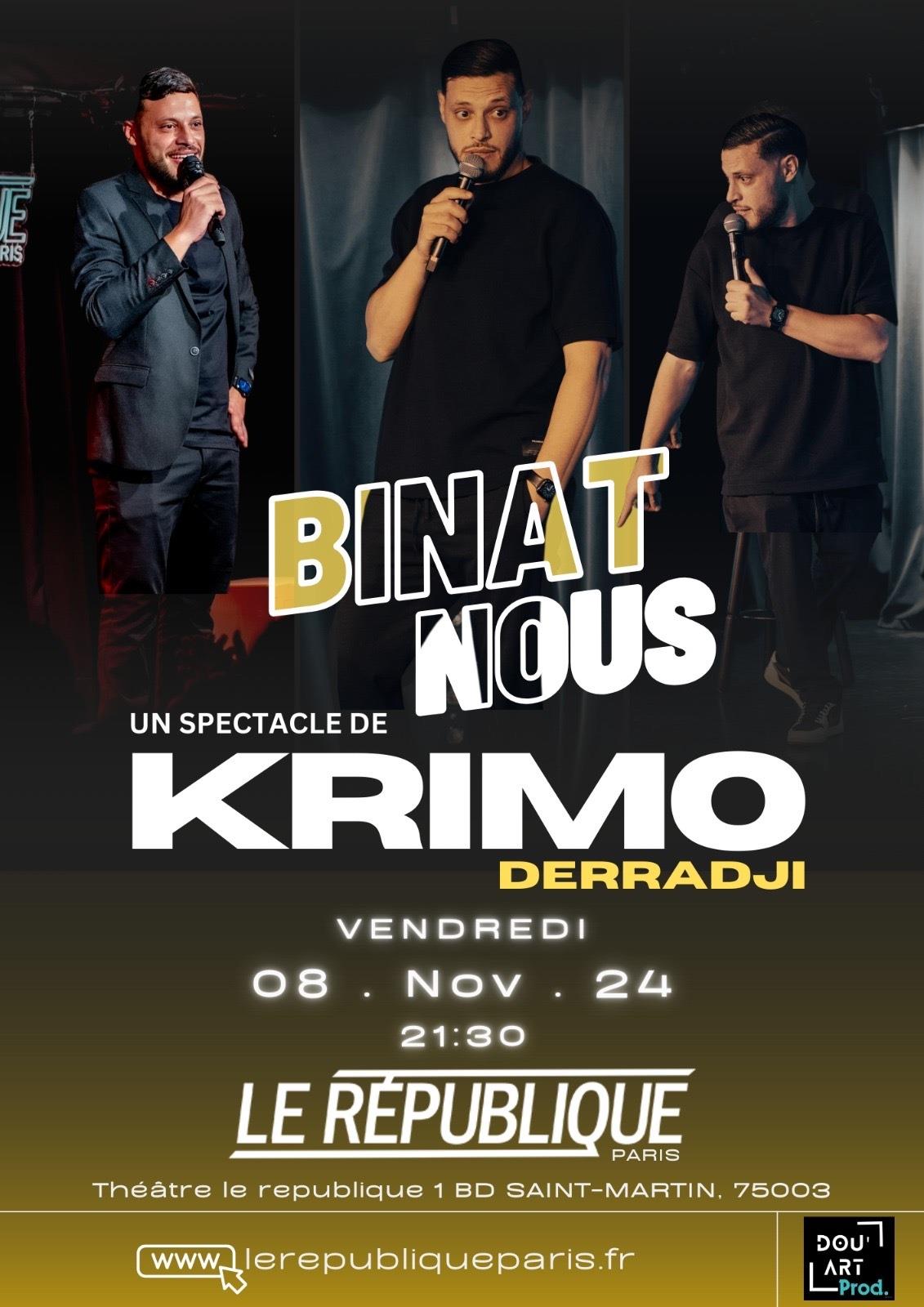 Binat-nous (entre-nous) est le premier spectacle en France de Krimou Derradji. Dans ce spectacle intime, Krimou nous raconte son enfance et sa vie au sein d'une famille (très) nombreuse d'Alger.