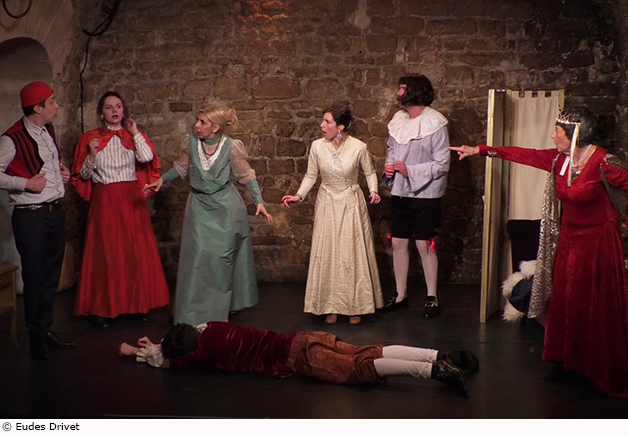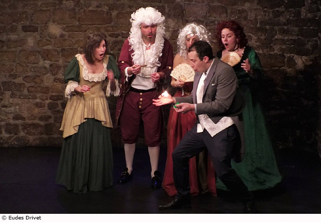Le Maître du Vaudeville nous régale de ses quiproquos et situations comiques. Un amant qui vient du futur, un mari trompé nommé Henri IV. La mécanique du rire nous emporte au fil des siècles. L’écriture, rythmée, met l’accent sur le mouvement. La langue s’invente, les jeux de mots, les traits de satire, se pressent au service de la comédie.