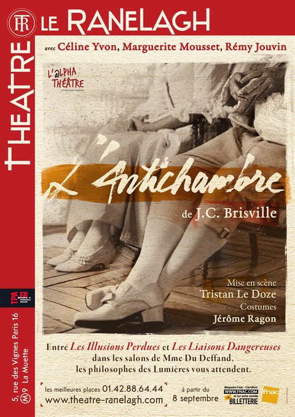 L’Antichambre est indéniablement une pièce historique, (l’action se déroule au XVIIIème siècle, et les personnages ont réellement existé), pour autant les problématiques qu’elle soulève sont d’une brûlante actualité. Comme il l’a fait avec Le Souper, Jean-Claude Brisville reprend le procédé du dialogue de deux personnages qui défendent chacun une cause opposée à l’autre ; ici, l’éternelle querelle entre les Anciens (incarné par Madame Du Deffand) et les Modernes (en la personne de Mademoiselle de Lespinasse). La dispute philosophique se mue en rivalité amoureuse où le tragique et la comédie se côtoient. La pièce présente alors une double nature qui lui évite de sombrer dans la lourdeur didactique qu’on pourrait craindre d’une œuvre mettant en scène un débat d’idées.