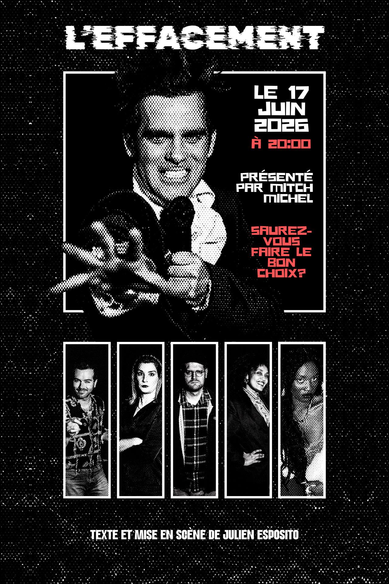 Ne ratez pas ce rendez-vous exceptionnel, animé par l'incomparable Mitch Michel ! Venez témoigner, vibrez avec les participants et offrez à l'un d'entre eux la rédemption tant espérée ! Participez à L'Effacement, l'émission qui redonne une seconde chance !