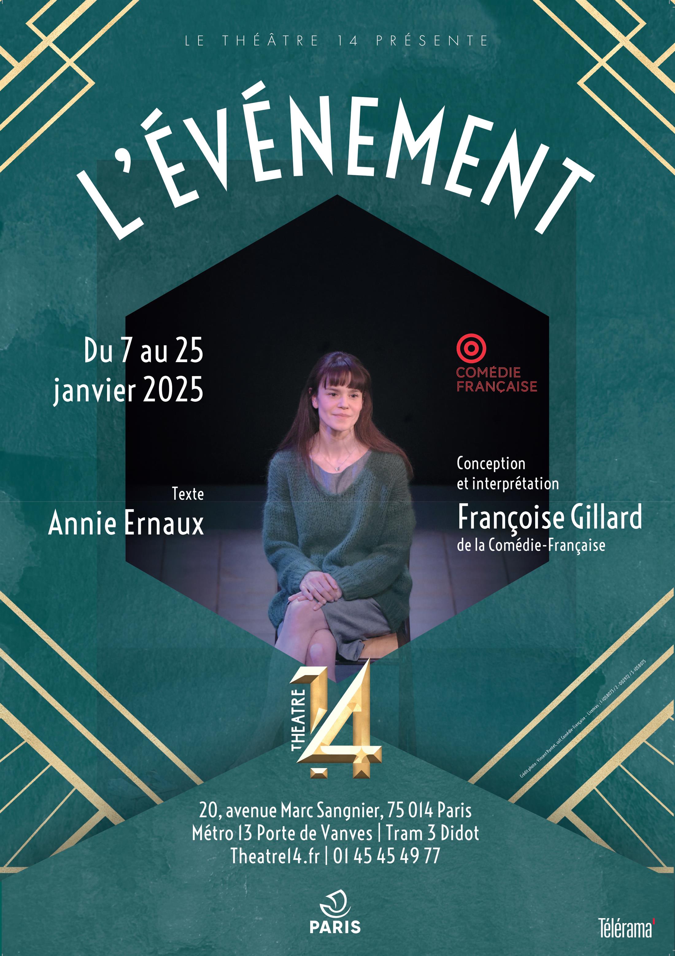 Récit autobiographique terrifiant et sensible, à valeur d'exorcisme, raconté dans la simplicité violente et cruelle des faits, L'Événement rappelle une société engoncée dans ses principes, ses tabous et ses préjugés de classe, en même temps qu'il révèle un événement vécu comme une initiation. La voix d'Annie Ernaux, Prix Nobel de littérature 2022, rencontre celle de Françoise Gillard, de la Comédie Française.