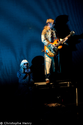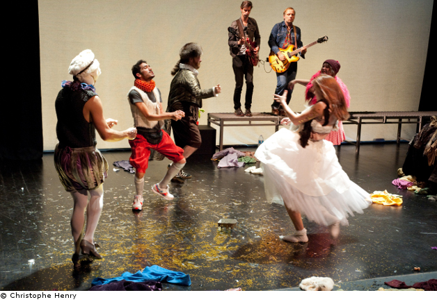 La musique se fera la complice du texte. Elle colore ici des univers en perpetuelle tension, entre la farce et l’amertume. Elle accompagne les différents niveaux de mise en théâtre de la pièce, des paysans jouent aux riches, qui eux feignent la pastorale poétique, comme une spirale où chacun se perd d’un commun accord. La musique structure le temps, crée des rythmes, des suspensions, développe des silences. Romain Guerret et Arnaud Pilard, les deux guitaristes du groupe Aline, composeront un univers sonore original, coloration et jeux de tissage entre texte et musique, dans un souci premier de porter le texte, de suivre dans un subtil jeu d’équilibre la richesse dramaturgique de la pièce.