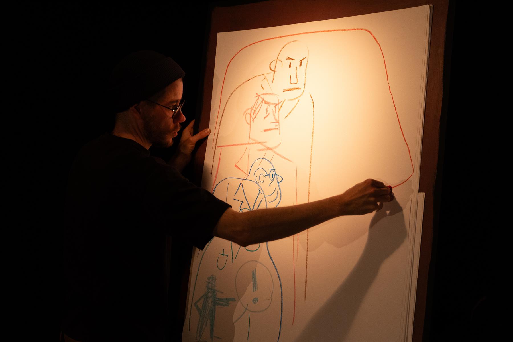 Un dessinateur est dans son atelier et n’a pas très envie de travailler ; comme tous les jours, il se laisserait volontiers distraire par d’autres activités. Aujourd’hui étrangement, c’est plus fort que lui, quelque chose gronde à l’intérieur, comme une bête sauvage.
