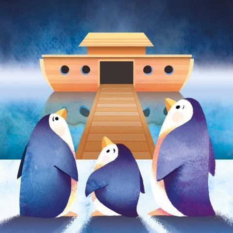 Absorbés par leur discussion, les trois amis ne voient pas tout de suite que la pluie s’est mise à tomber. Et quelle pluie ! Un vrai Déluge ! Heureusement, la colombe arrive juste à temps avec des tickets pour l’Arche de Noé. Mais il n’y a que deux places par espèce…