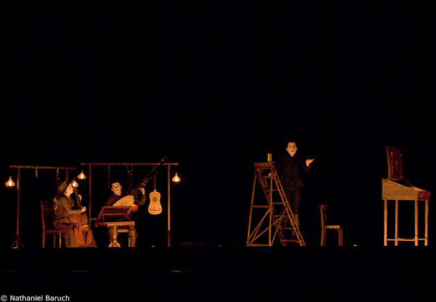 Avec ce spectacle, déjà présenté à l’Athénée en 2008 et 2013, mais aussi avec Les Amours tragiques de Pyrame et Thisbé et de nombreuses mises en scène d’opéra, Benjamin Lazar a porté très haut la gestuelle et la diction baroques, dont il est devenu le passeur éclairé. Au récit de ce voyage intergalactique, il a voulu donner « la forme simple d’un conte – un escabeau de bibliothèque, une chaise, un haut pupitre de travail sont tour à tour sollicités pour devenir machine volante, dragon de feu, prison, cheminée, théâtre de marionnettes… »