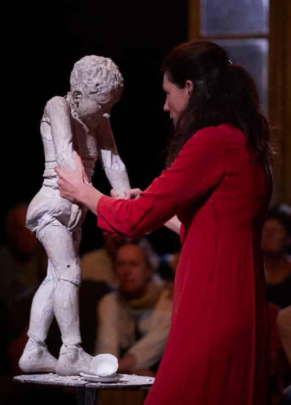 Dans une mise en scène créant un espace organique qui parle à tous les sens, la marionnettiste plasticienne manipule la simplicité brute des éléments et suscite une poésie saisissante, à la fois visuelle et littéraire. Dans un espace scénique éclaté, elle trouble nos habitudes de spectateurs, tout en nous rapprochant de l’action. Espaces labyrinthiques, scénographies éphémères, figures animées, vibrations sonores, sont autant d’éléments qui nous plongent dans un monde en perpétuel surgissement, en constant devenir, et qui métamorphose notre perception du réel.