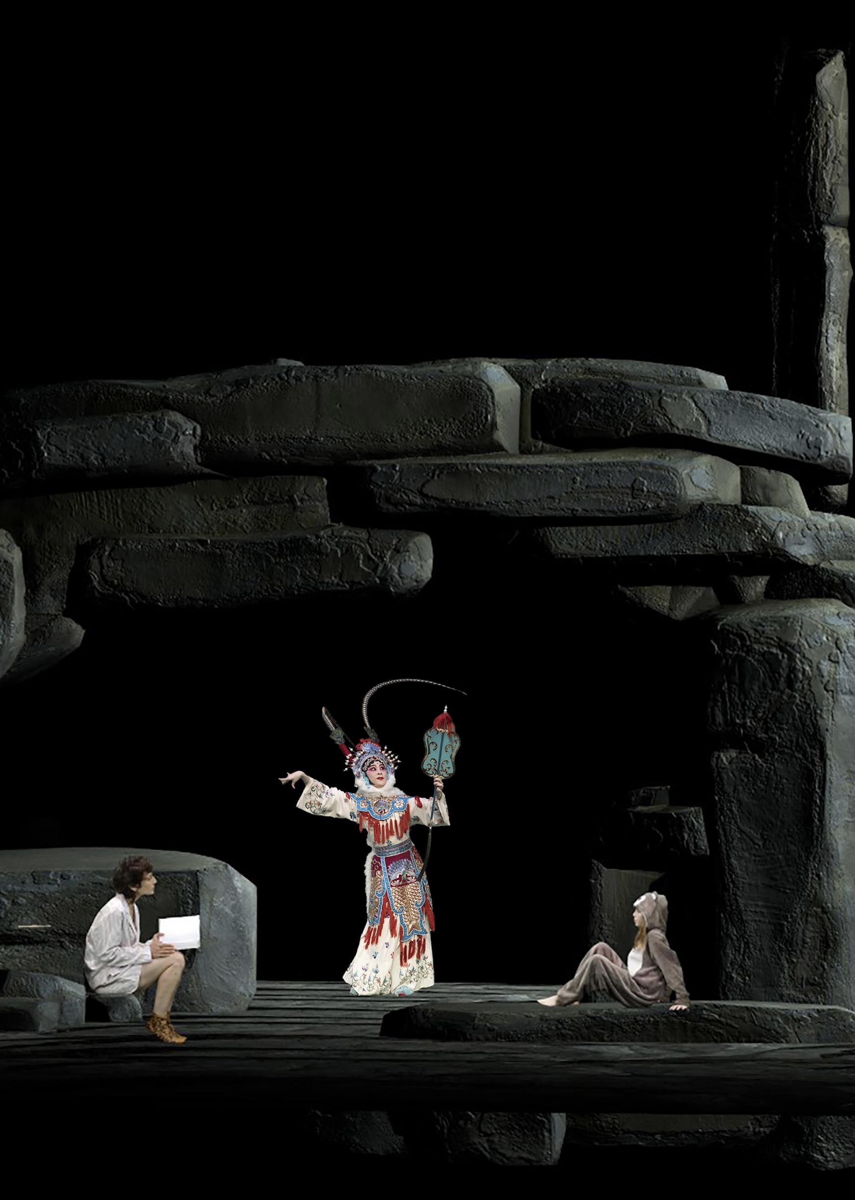 « Le spectacle commence, dans la chambre d’Olivia, alors que ses parents entament la lecture de cet épisode pour qu’elle s’endorme apaisée. Progressivement, le monde réel s’efface et nous rentrons au cœur de l’histoire, jouée par des artistes d’opéra dit Xiqu. L’univers de la fable se déploie grâce au registre onirique et spectaculaire de cet art traditionnel, combinant chant, théâtre et arts martiaux. Ces deux mondes s’entrecroisent et se mettent à dialoguer. Même lorsqu’elle ne lit pas, Olivia continue à voir dans sa chambre certains personnages de l’histoire, elle projette sur son père et sur sa mère les figures de la princesse et du singe. Elle perçoit, derrière ce récit ancien, une métaphore du monde actuel. La quête du singe devient la sienne. Et s’il existait un éventail magique, qui lui permette de lutter contre le réchauffement climatique, la multiplication des incendies de forêts, mais aussi contre les menaces aériennes que font planer les avions qui survolent sans cesse son pays ? »
