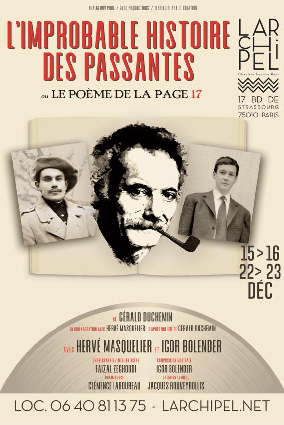 quel bonheur!Merci à Hervé Masquelier, merveilleux comédien, à Gérald Duchemin,co-auteur du texte et à Faizal Zeghoudi pour la mise en scène judicieuse et je n'oublie pas l'excellent Igor Bolender pour l'accompagnement musical.Merci à toute l'équipe pour ce travail d'intelligence du coeur,pour toutes celles et ceux qui aiment le patrimoine de la chanson Française,la poésie,et Georges Brassens.Merci à l'Archipel pour nous avoir jusqu'à aujourd'hui,offert des spectacles de qualité,dont ces passantes sont un bel exemple.Je me permets de rajouter que ces passantes pourraient faire un tour du côté du Hall de la chanson...lieu d'excellence s'il en est!