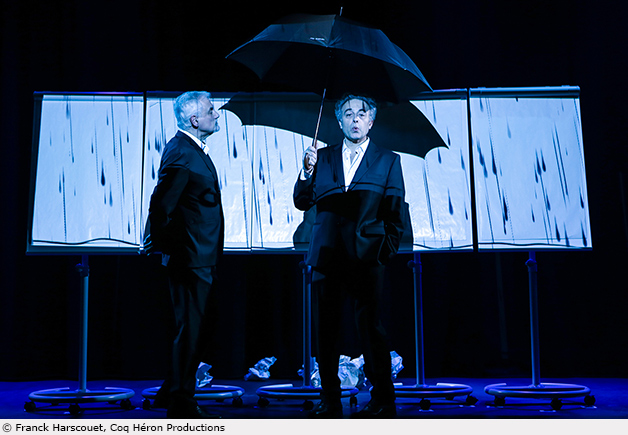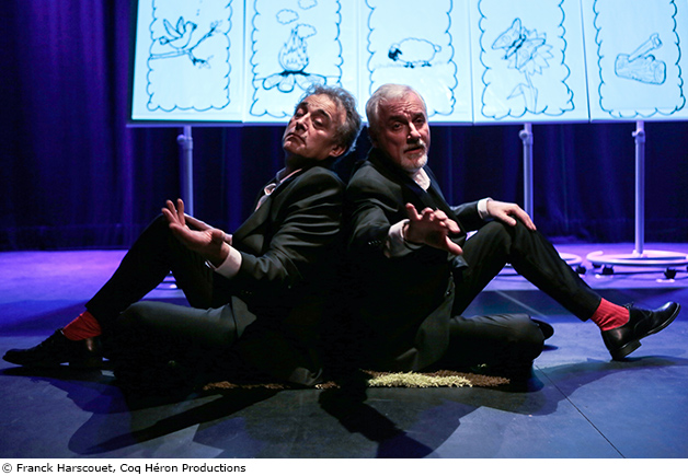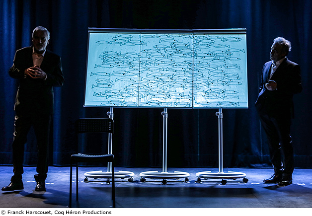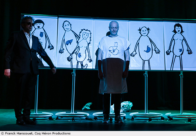 Vous trouverez dans ce spectacle des histoires de canots de sauvetage qui risquent de couler si on ne sacrifie pas un passager, de criminels invisibles, de machines à donner du plaisir, de tramways fous, de poissons d’élevage heureux, de races entières d’animaux qui disparaissent parce qu’on les aime beaucoup.