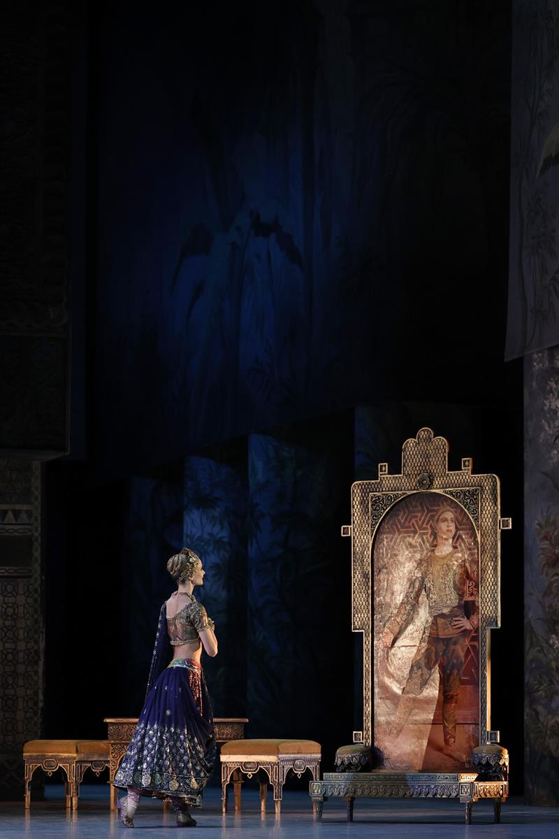 Dans une Inde fantasmée, où un gigantesque éléphant parade devant le somptueux palais du rajah et où une idole dorée succède à une danse des éventails, le ballet raconte les amours contrariées du guerrier Solor avec la bayadère Nikiya, une danseuse sacrée.