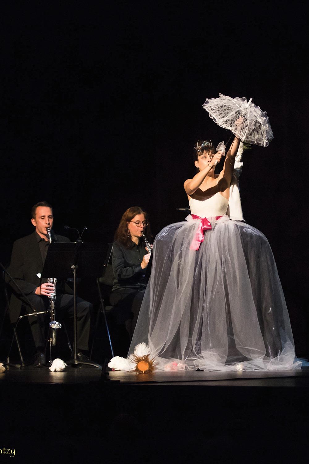 À la faveur d’une nuit magique, l’intrigue amoureuse entre trois « joujoux », Polichinelle, le Soldat et la Poupée, se déploie avec ludisme et grâce, portée par le souffle et l’expressivité des musiciens du quatuor de clarinettes. L’immense robe de la conteuse espiègle et malicieuse se transforme en une véritable « boîte à joujoux » : tantôt creuset d’apparitions surprenantes, tantôt castelet dans lequel évoluent les marionnettes, tantôt décor à dimensions variables…