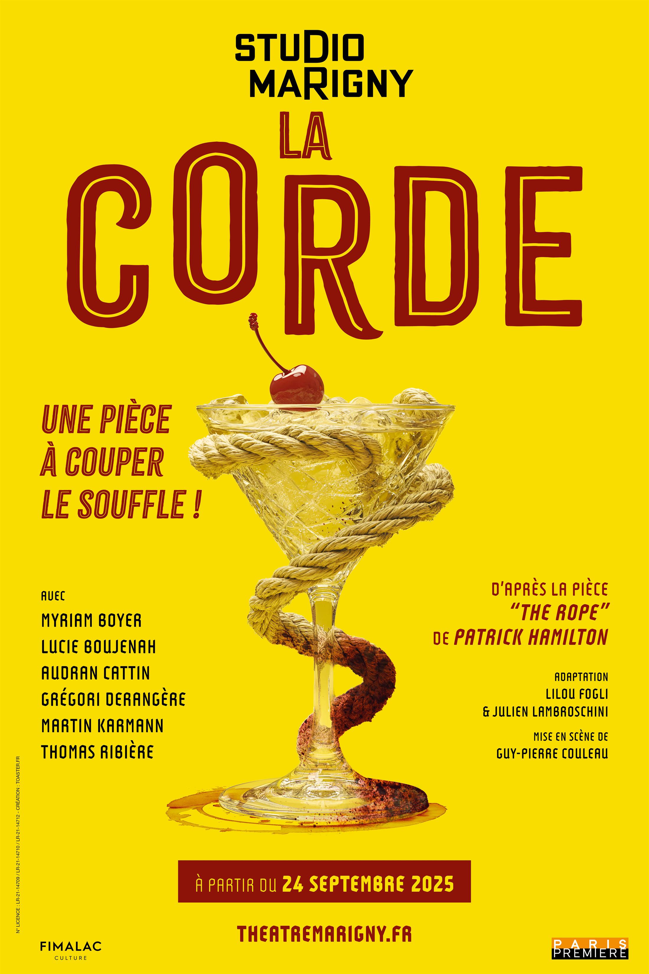 Nouvelle création pour la rentrée 2025 ! La Corde, un thriller policier en trois actes, adapté de la pièce The Rope de Patrick Hamilton et rendu mythique par le maître du suspense, Alfred Hitchcock. Dans cette nouvelle version modernisée, les spectateurs seront immergés dans un huis clos machiavélique et comique, entre jeu et manipulation. Qui vaincra entre la morale et le pouvoir ? Venez le découvrir à partir du 24 septembre 2025, sur la scène du Studio Marigny.