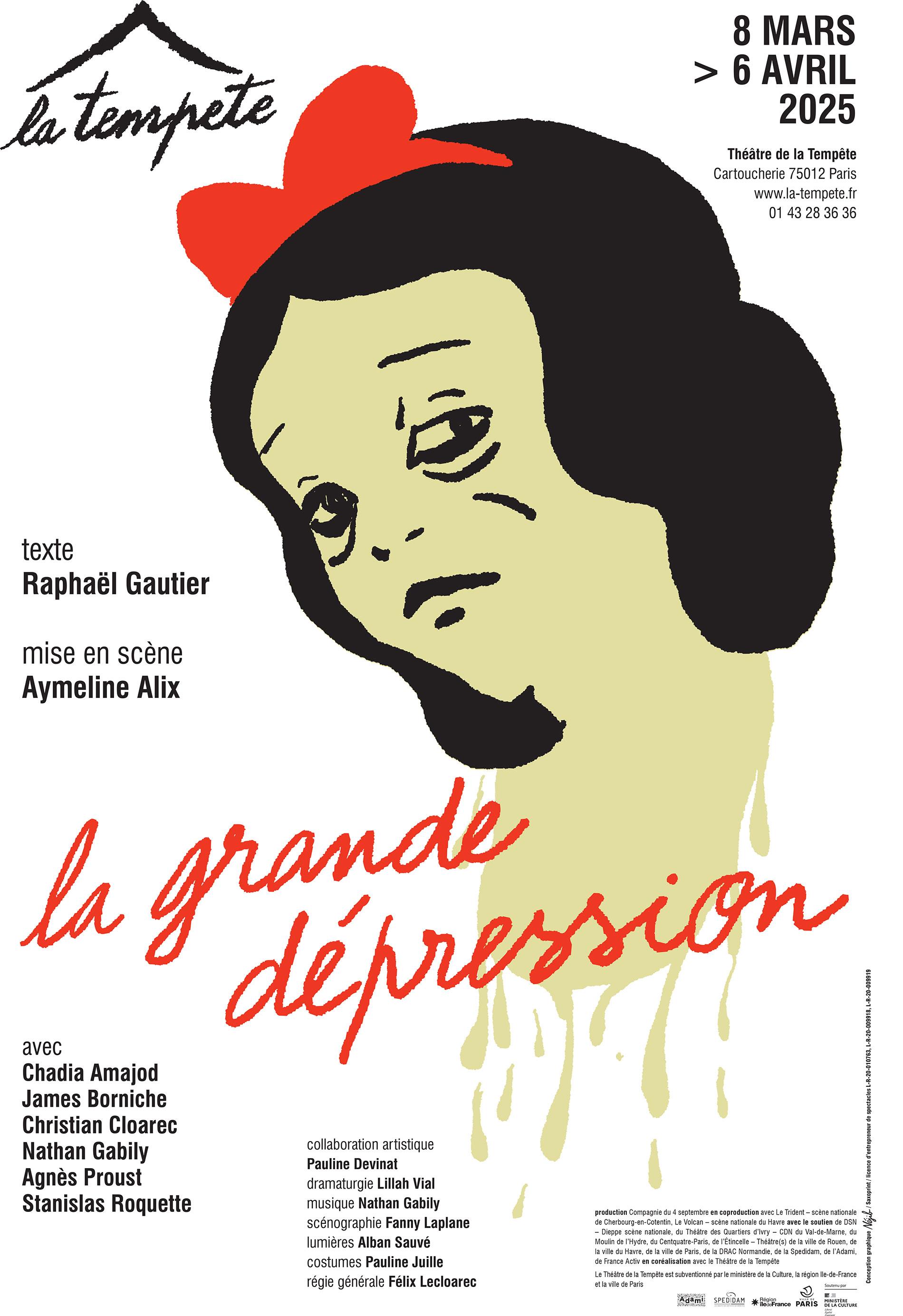 Outre le défi scénique que constitue la liste des 43 personnages fictionnels ou réels que les comédien.ne.s doivent interpréter – Disney, Simba du Roi Lion, employés du parc Disneyland Paris, mais aussi Hitler, Goebbels ou Leni Riefensthal –, La Grande Dépression a rebondi en moi à un moment de ma vie où je m’interrogeais sur cette maladie qu’est la dépression et qui touche des millions de gens à travers le monde.