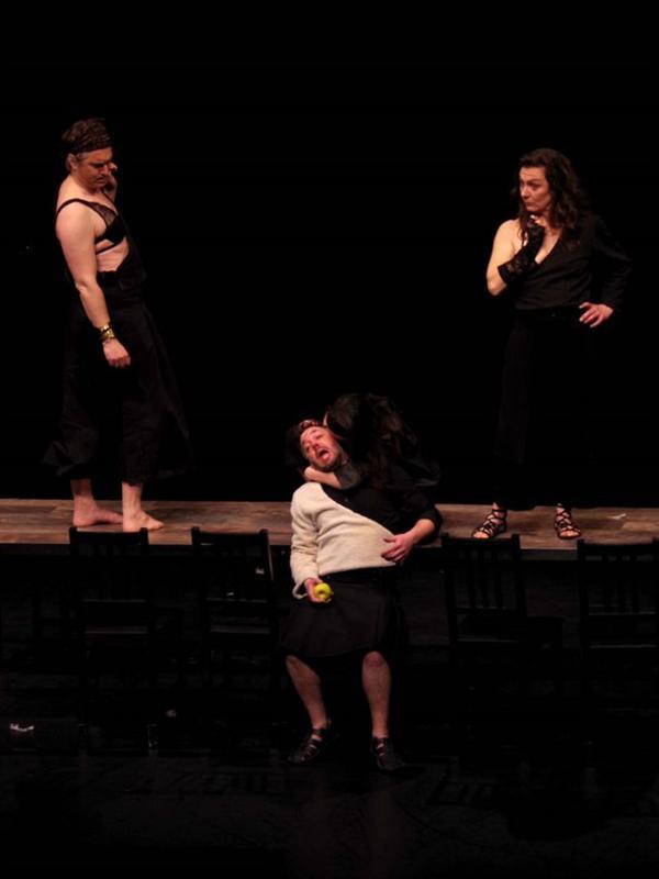 Le projet s’attache à retracer la « miniature » d’une immense fresque mythologique, tout en tâchant d’en traduire le souffle d’épopée. La mise en scène est ancrée dans ce jeu de confrontation entre le petit et le grand, comme un « petit cirque de Calder » qui se déploierait d’une piste-table au plateau et au grand cirque du monde. Unique scénographie, quelques chaises et une table donc (qui rappellent par ailleurs l’importance des banquets dans l’histoire). De cette table naît une ébauche de théâtre d’objets, d’accessoires miniatures, de figurines. Ce jeu sur l’objet, nous l’avons développé dans notre travail depuis la rencontre avec Cécile Pelletier – costumière et plasticienne étonnante, aussi bien dans une installation à la Boltanski dans Elias Leister a disparu, que dans l’exposition finale de Jeanne Barré ou dans une petite forme à la table autour du conte d’Hansel et Gretel. Il sert ici de support à la narration : la belle Hélène par exemple, n’est jamais « interprétée » mais apparaît, très symboliquement, seulement sous forme de poupée. Au fil des tableaux, ce monde en miniature s’ouvre sur la scène. Les narrateurs-manipulateurs investissent l’espace et se font acteurs, deviennent en quelque sorte leur propre marionnette.
