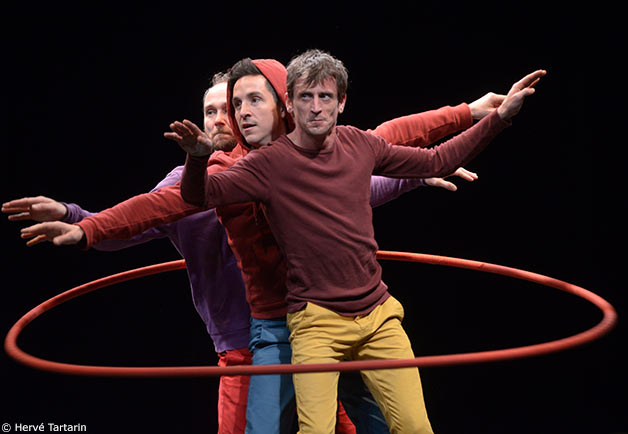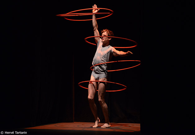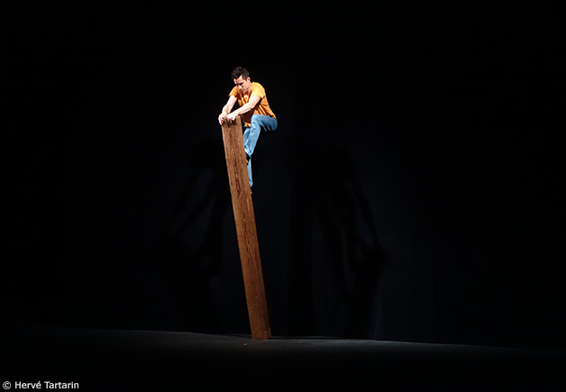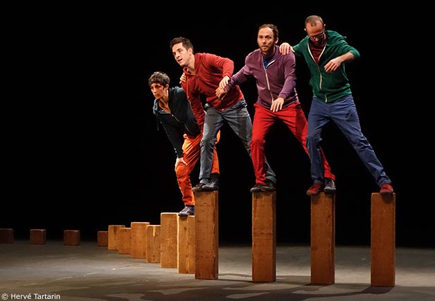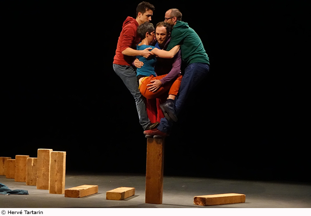 Cette compagnie, a quelques sujets d’élection : la prise de risque, l’auto-destruction et… la chute ! Ici, on le voit bien, tout va être question d’équilibre : en avoir ou pas… Leur agrès, de simples blocs de bois (les « bastaings »), deviennent totems fragiles ou piliers destinés à nous faire traverser une mer imaginaire. Et leur hula hoop version XXL menace à chaque instant de finir par terre. Qu’importe, l’essentiel est d’essayer, encore et toujours. N’est-ce pas la fatalité de la vie humaine que de s’entêter à y croire ?