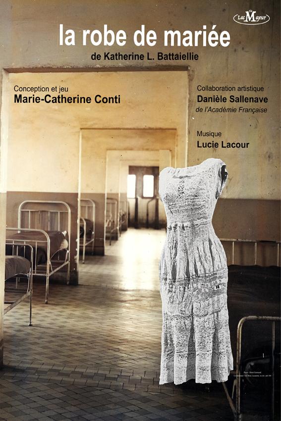 Je ne suis pas rentée dans cette robe de mariée...quel dommage car Marguerite (la comédienne) était par moments très touchantes mais je me suis ennuyée et pourtant, n'y a t-il pas de meilleur asile que le Théâtre que j'aime à la folie! Marguerite a bien existé et fut internée à Saint Alban en Lozère ou elle se distingua par ses broderies narratives dont cette robe de mariée tissée en fil de draps. Cet asile durant la seconde guerre mondiale servi de refuge aux juifs et résistants. Pour la petite histoire Denise Glazer y trouva refuge ainsi que Paul Eluard et Nush son épouse (souvenirs de la maison des fous).. Dubuffet remarqua le talent de certains artistes "résidents" ,fit l'acquisition de cette fameuse robe (visible de nos jours au musée d'Art brut).Cet asile, ou les patients étaient traités d'une façon humaniste, permis l'émergence d'un courant dit l'Art Brut …Le sujet était dense et passionnant. Art et psychiatrie. Mais hélas sa transcription théâtrale manquait cruellement de souffle et j'ai fini par m'ennuyer.