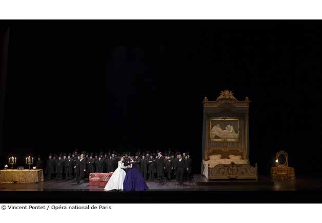 Est-il besoin de rappeler l’argument de La Traviata inspiré de la vie de Marie Duplessis ? D’après La Dame aux camélias d’Alexandre Dumas fils, Verdi écrivit le grand opéra du tragique féminin. Celui où, déchirée entre l’amour et le devoir moral, l’héroïne succombe à la maladie gangrenant le corps et l’âme rompue au sacrifice. Un drame où, sous couvert de débauche, la société autorise les sentiments extrêmes et contrarie la pudeur des plus fragiles émotions par son voyeurisme malsain. Le personnage de Violetta s’expose dans la mise en scène de Benoît Jacquot telle l’Olympia de Manet, en proie aux regards des spectateurs venus l’effeuiller.