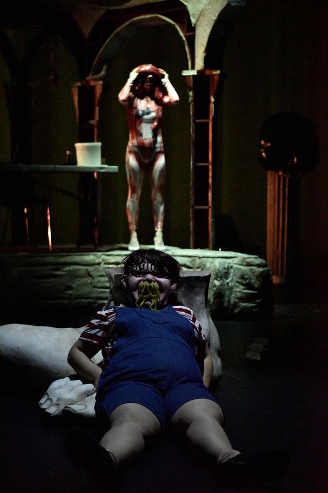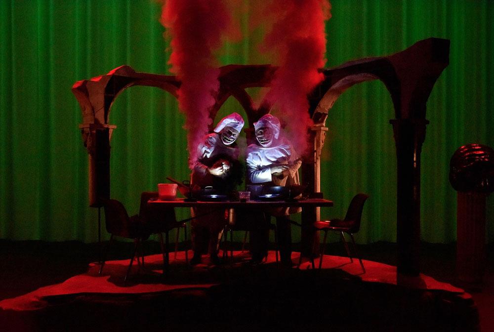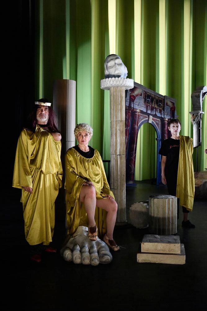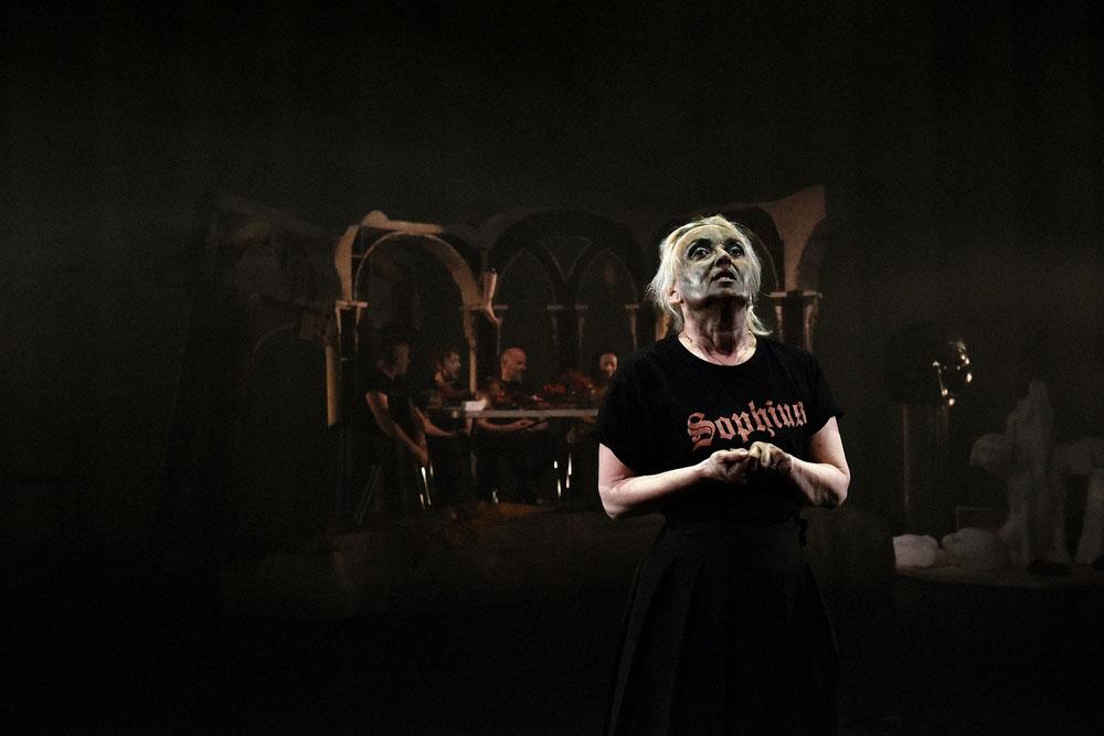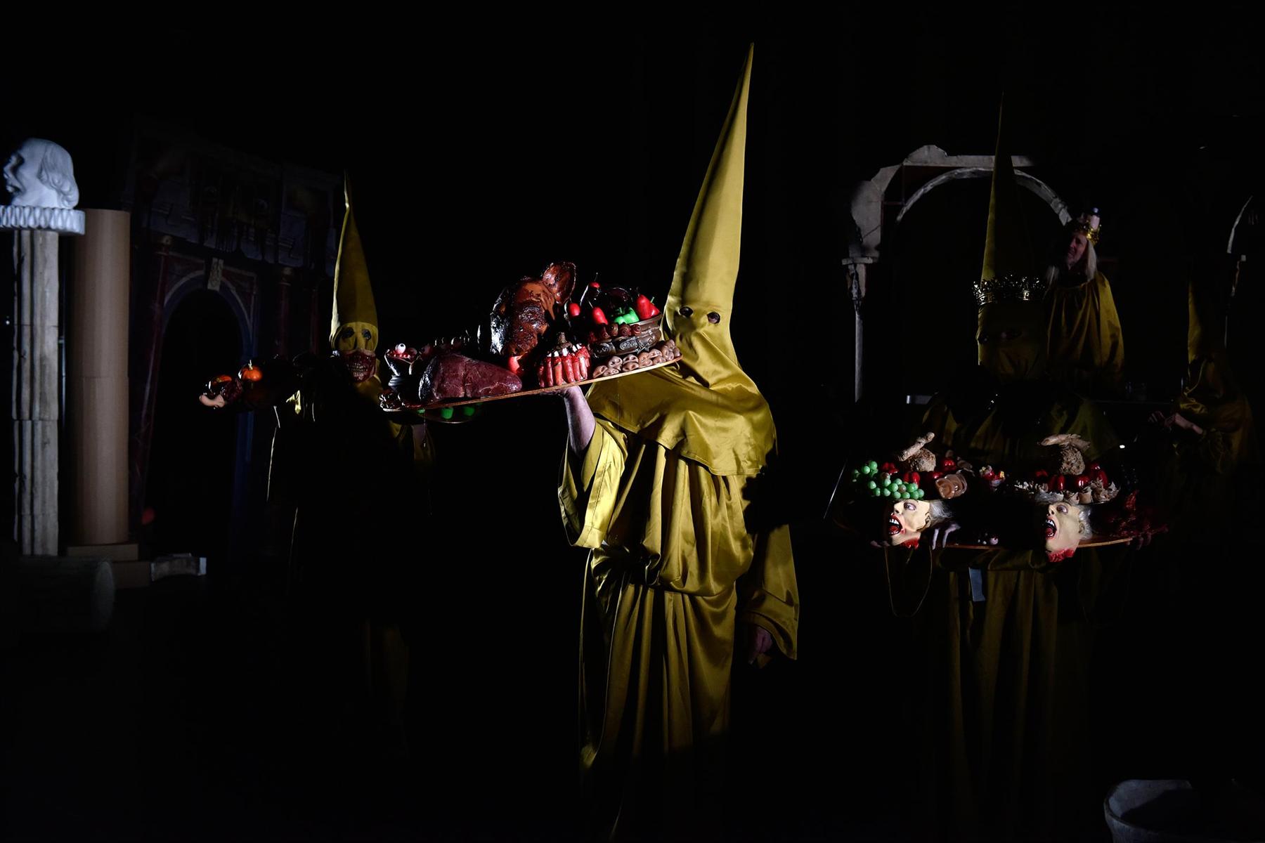 Réputée pièce la plus sanglante de William Shakespeare et parmi les moins jouées, Titus Andronicus ou La Très Lamentable Tragédie romaine de Titus Andronicus est moins une histoire de vengeance qu’une histoire de chaos. Rien d’étonnant donc à ce qu’elle trouve un écho auprès de la compagnie du ZEREP, dirigée par la plasticienne de formation Sophie Perez, dont la particularité est d’explorer un théâtre délibérément affranchi de la moindre hiérarchie, « où bordels populaires et raffinements avant-gardistes sont renvoyés dos-à-dos pour mieux en éprouver les mystères et les mystifications ». La vengeance est un plat. est une exploration éclairée, métaphorique et très personnelle de Titus Andronicus. La scénographie et les costumes signés Sophie Perez plantent une sorte d’esthétique maudite, entre pénitents affairés, têtes coupées, marching band hypnotique, colonnes antiques et ruines grandioses, on assiste à un carnaval psychique, une parade antique sans concessions.
