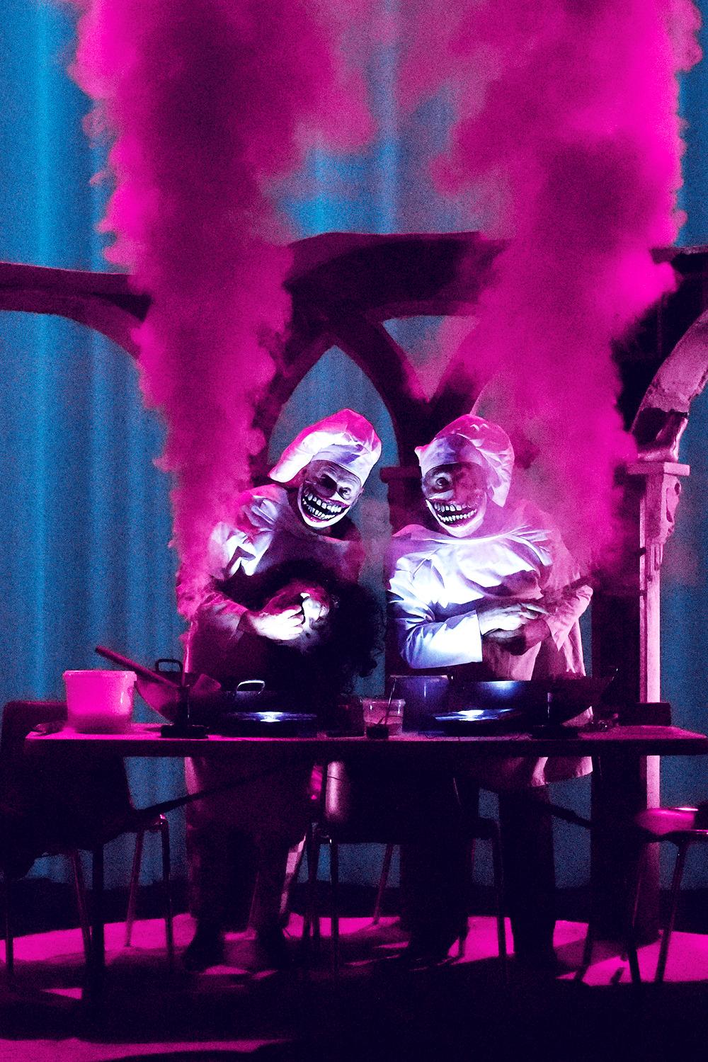 Réputée pièce la plus sanglante de William Shakespeare et parmi les moins jouées, Titus Andronicus ou La Très Lamentable Tragédie romaine de Titus Andronicus est moins une histoire de vengeance qu’une histoire de chaos. Rien d’étonnant donc à ce qu’elle trouve un écho auprès de la compagnie du ZEREP, dirigée par la plasticienne de formation Sophie Perez, dont la particularité est d’explorer un théâtre délibérément affranchi de la moindre hiérarchie, « où bordels populaires et raffinements avant-gardistes sont renvoyés dos-à-dos pour mieux en éprouver les mystères et les mystifications ». La vengeance est un plat. est une exploration éclairée, métaphorique et très personnelle de Titus Andronicus. La scénographie et les costumes signés Sophie Perez plantent une sorte d’esthétique maudite, entre pénitents affairés, têtes coupées, marching band hypnotique, colonnes antiques et ruines grandioses, on assiste à un carnaval psychique, une parade antique sans concessions.