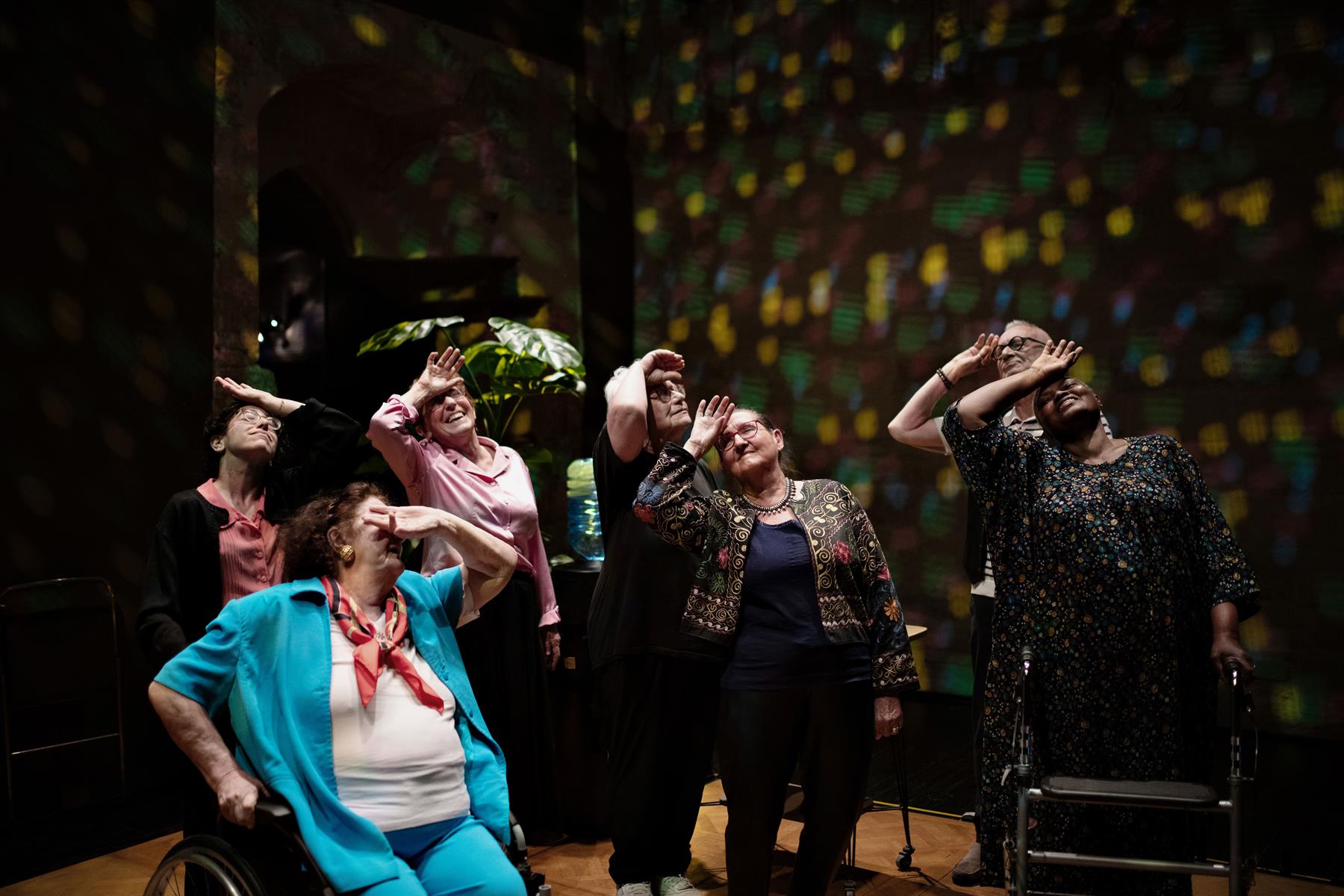 Sur le parquet d’une salle de bal, huit vieilles et vieux parlent d’amour et de sexualité. Chacune et chacun raconte son histoire pour se faire le porte-voix de toute une génération. Sous le regard du dramaturge et metteur en scène Mohamed El Khatib, de façon aussi drôle que poignante, ces témoins au crépuscule de leur existence viennent ainsi dessiner les paysages amoureux du troisième âge, façonnant le tableau nostalgique de leurs bilans affectifs. Avec toutefois, au fond du cœur, la promesse que le désir peut se manifester jusqu’au dernier souffle. Ce spectacle, qui ne tient qu’à un fil tant le lien qui relie chaque participant à la vie est ténu, brise avec subtilité les tabous qui entourent l’intimité des personnes âgées. Il déploie la trame d’un récit intime et universel. Bouleversant !