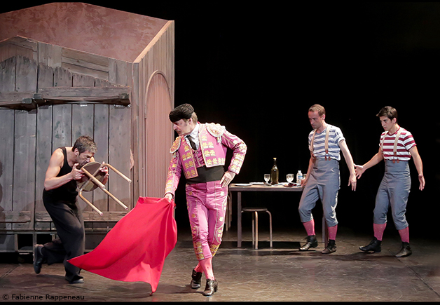 Toujours très peu client du jeu ultra-naturaliste au théâtre, aussi bien quand j’aborde le travail de mise en scène d’une oeuvre classique que celle d’une œuvre contemporaine, je vais chercher à raconter cette histoire avec beaucoup d’engagements physiques de la part de mes comédiens, de façon ludique et spectaculaire dans les parties de récits tauromachiques, mais aussi très soutenues dans les scène de jeu et de récit plus « traditionnels »… sans oublier les respirations silencieuses, ou musicales, nécessaires à la respiration des comédiens… et des spectateurs.