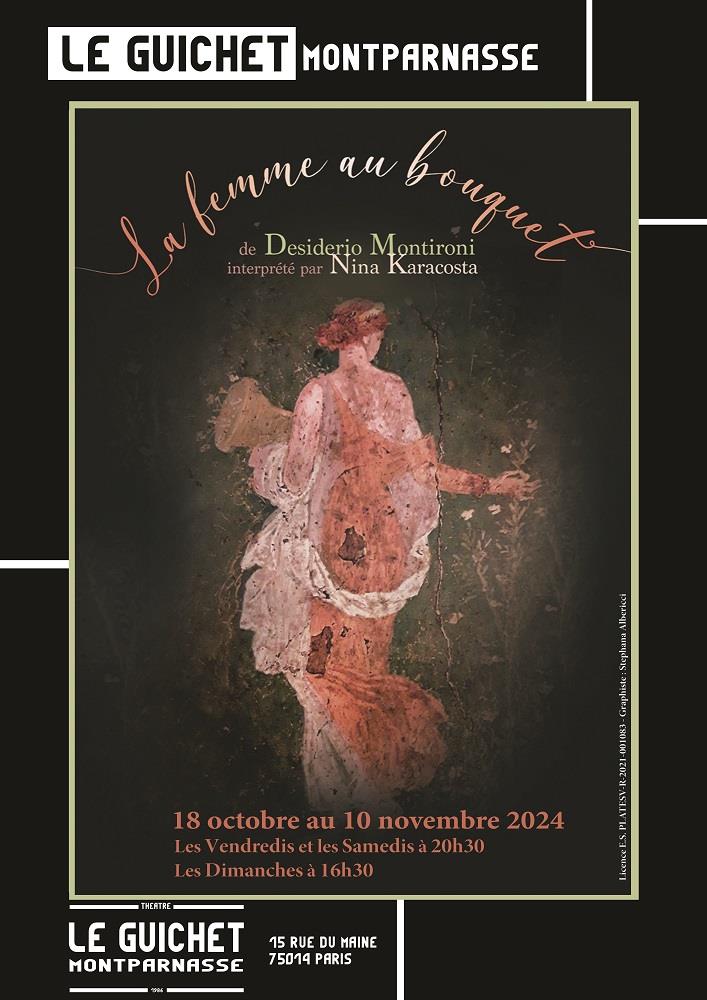 Coup de cœur pour cette pièce de Desiderio Montironi, admirablement interprétée par Nina Karacosta. Décors simplissime et raffiné à la fois, dans l'accueillant petit théâtre « Du Guichet Montparnasse ». La « Femme au Bouquet » nous livre ses pensées les plus intimes, pêle-mêle, dans une rêverie poétique... où parfois les mots achoppent, s'emmêlent, en lien avec les souvenirs et d'autres « maux » dissimulés. Sommes-nous discrètement tapis dans un cabinet d'analyste... ? Assistons-nous à une rencontre mouvementée entre une salariée déboussolée et son manager... ? Chacun pourra entendre cette pièce avec sa propre sensibilité et se laisser porter par la portée philosophie de cette œuvre. A ne surtout pas manquer !